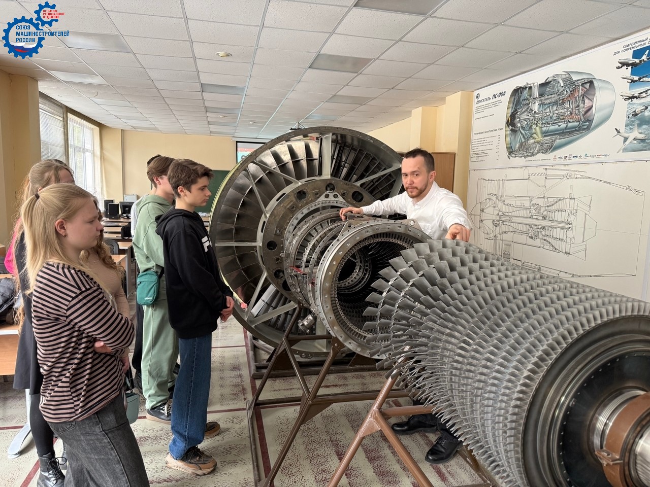 Ребята узнали, как проектируется авиационный двигатель, какие научные задачи решает инженер-конструктор, где нужно учиться, чтобы работать в сфере двигателестроения, а также приняли участие в викторине по авиационной тематике. После встречи преподаватели кафедры провели для девятиклассников экскурсию по лабораториям кафедры.
