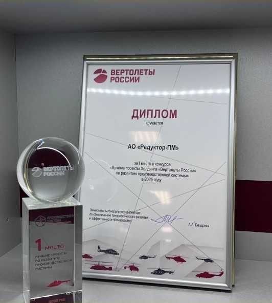Коллективу Редуктор-ПМ (член Союза машиностроителей России) был вручен кубок за победу в конкурсе холдинга «Вертолеты России» на лучшую группу проектов по развитию производственной системы (РПС).