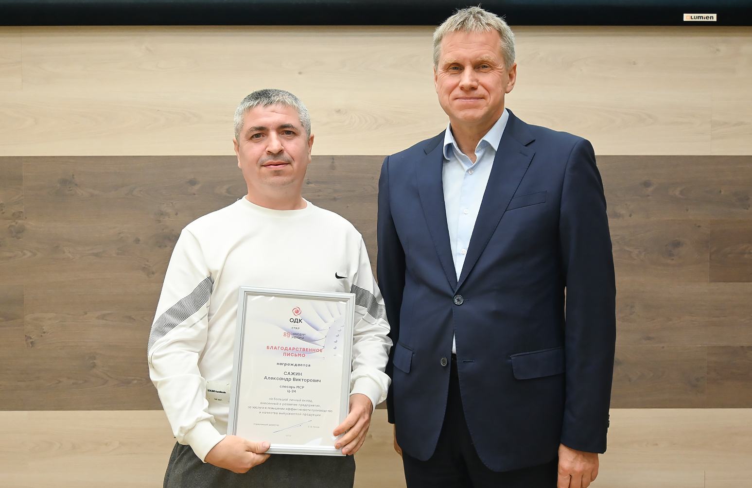 Председатель Пермского реготделения СоюзМаш России Сергей Попов вручил Благодарственные письма ОДК-СТАР 19 заводчанам. Церемония была приурочена к Дню машиностроителя и организована Пермским РО СоюзМаш России. Среди награжденных – слесарь механосборочных работ цеха 24 Александр Сажин.